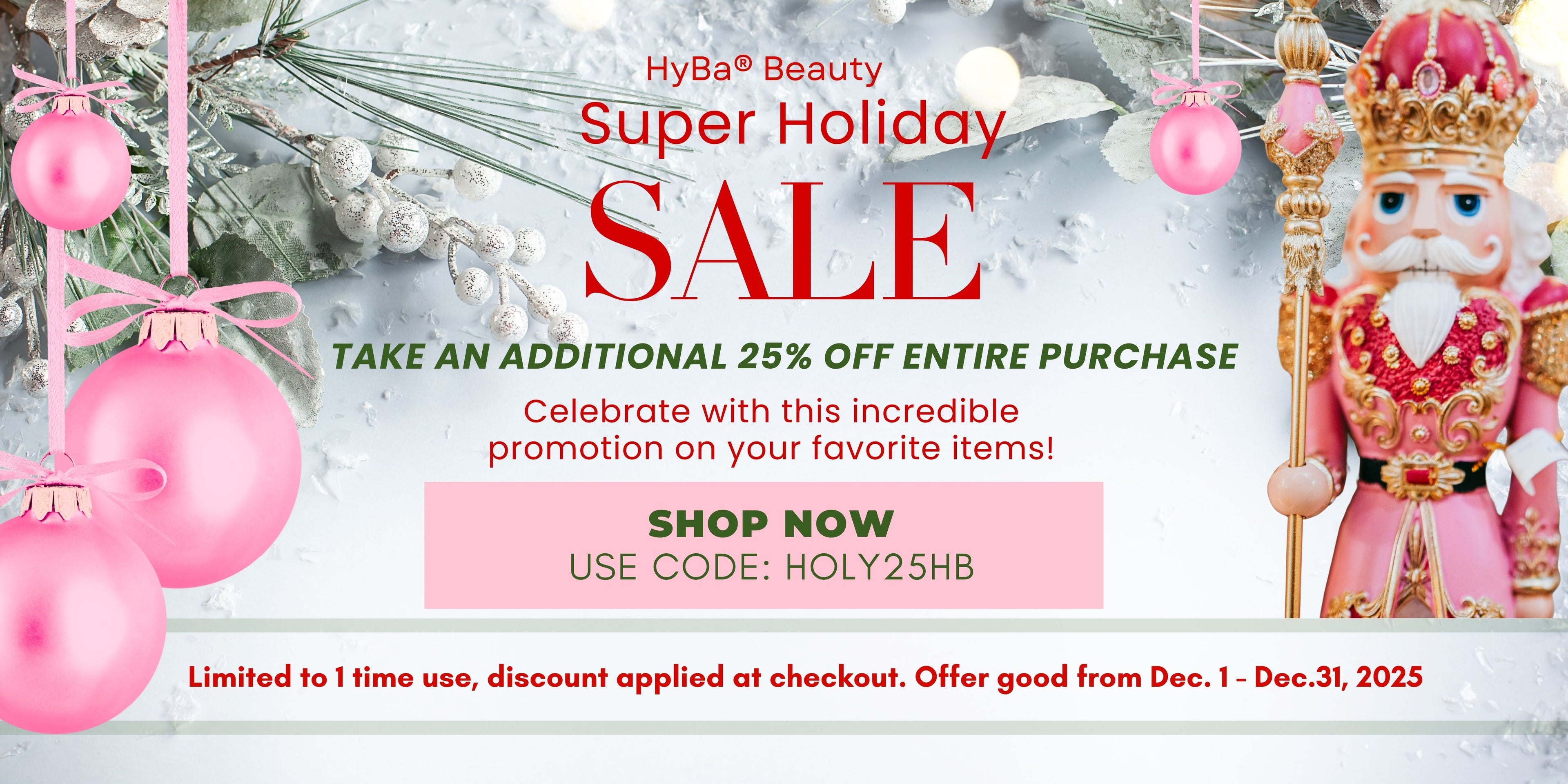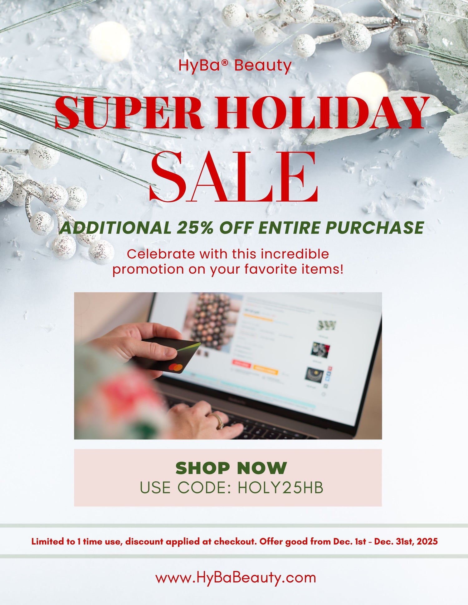Shop 24/7 online this holiday season. Skip the long lines and crowds. HyBa® Beauty has a special gift for you. Use this coupon code: HOLY25HB at checkout to receive an additional 25% off your entire order! Hurry while supplies last for this amazing promotion!